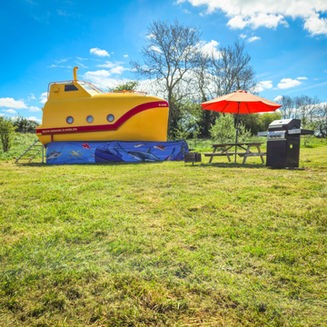 The Yellow Submarine is complete with a radar, Giant Octopus Detector, Shark Warning System, Anti-Whale-Bump technology and a special cool space for Mums’ wine. There are buttons to press, and knobs and dials and gauges and lights and real portholes. Look through the Periscope to check for any Sharks, Whales, Dolphins and Sea Monsters lurking nearby. There’s a Galley Kitchen with a hob, Fridge, Sink, Crockery, Cutlery, and all the bits & bobs you’ll need. Outside you’ll find your private area with seating, BBQ & Firepit.